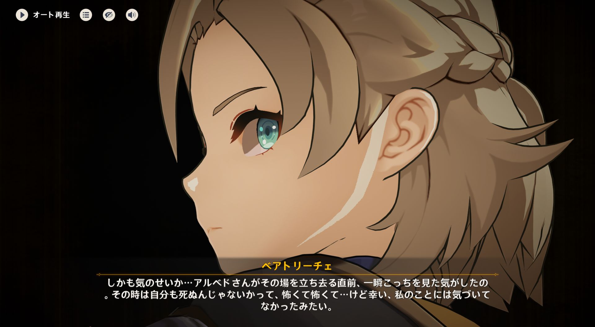 ・「ボクはレインドットとアリスさんがアルベドをモンドに送ったときから、そのことを知ってたよ。そんな人物が訪れるとなれば、モンドの関係者たちは気を緩められないでしょ?」言われてみたらその通り、というかそこらへん全く知らないな。レインドット→アリスさん→モンドって感じでアルベド先生は来たのかな。キャラスト読んだらわかるのかな