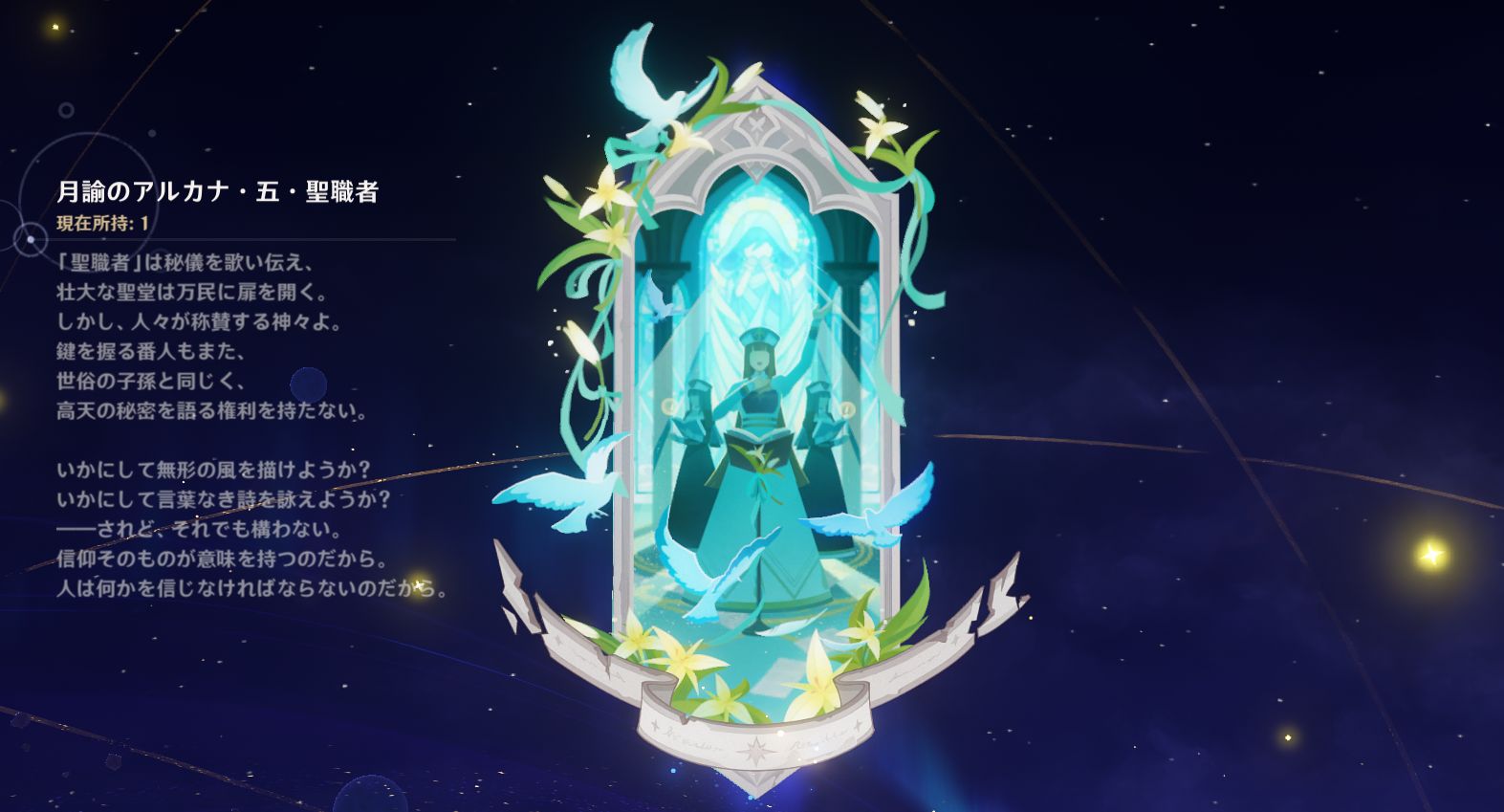 #genshin アルカナ、女帝(童話作家、ちびのお母さん)→太陽(マハールッカデヴァータの概念を感じる)ときて今月は聖職者だったんだけど、鳥とリボンとセシリアの花とステンドグラスの風神にニッコリした。わたしは戦績カード展示にウェンティを一番目に置いています。
