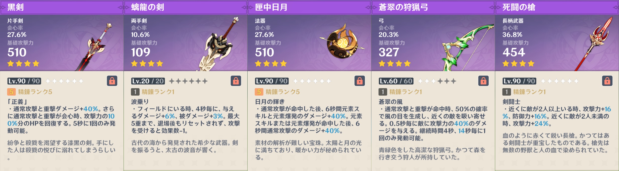 #genshin というわけで4.0紀行は匣中日月R5にした 探索は流浪、螺旋は日月使ってくれな