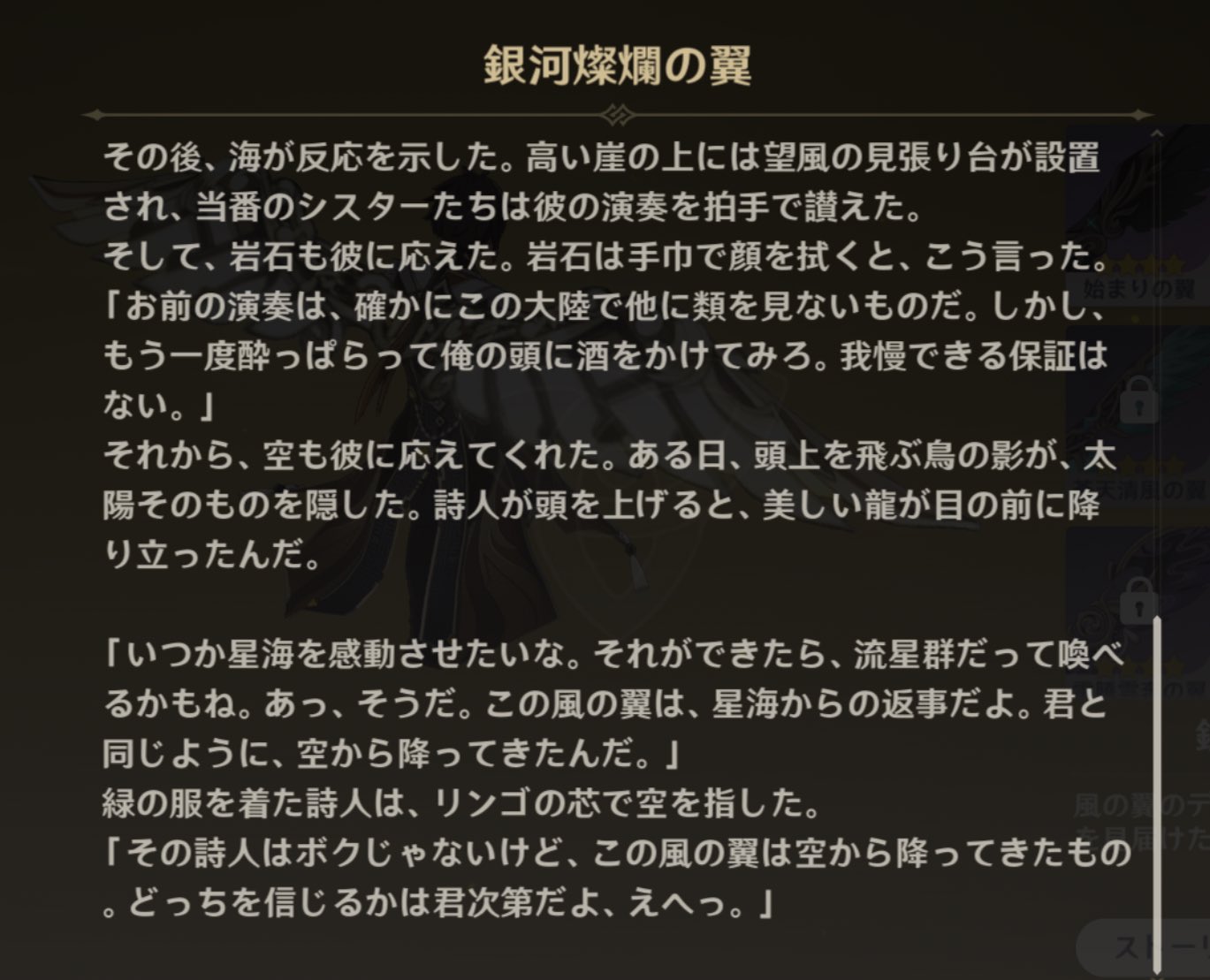 #genshin 旅人、私が知らん情報をしれっと選択肢で初出しして選ばせてくるし(なんか見落としのかと思った) こういうことっぽい……?と何となくしか把握できてない私を置いて結論に達してたりする プレイヤーのこと置いてきがち まあそれだけ多くの世界を旅してきた人だもんな……