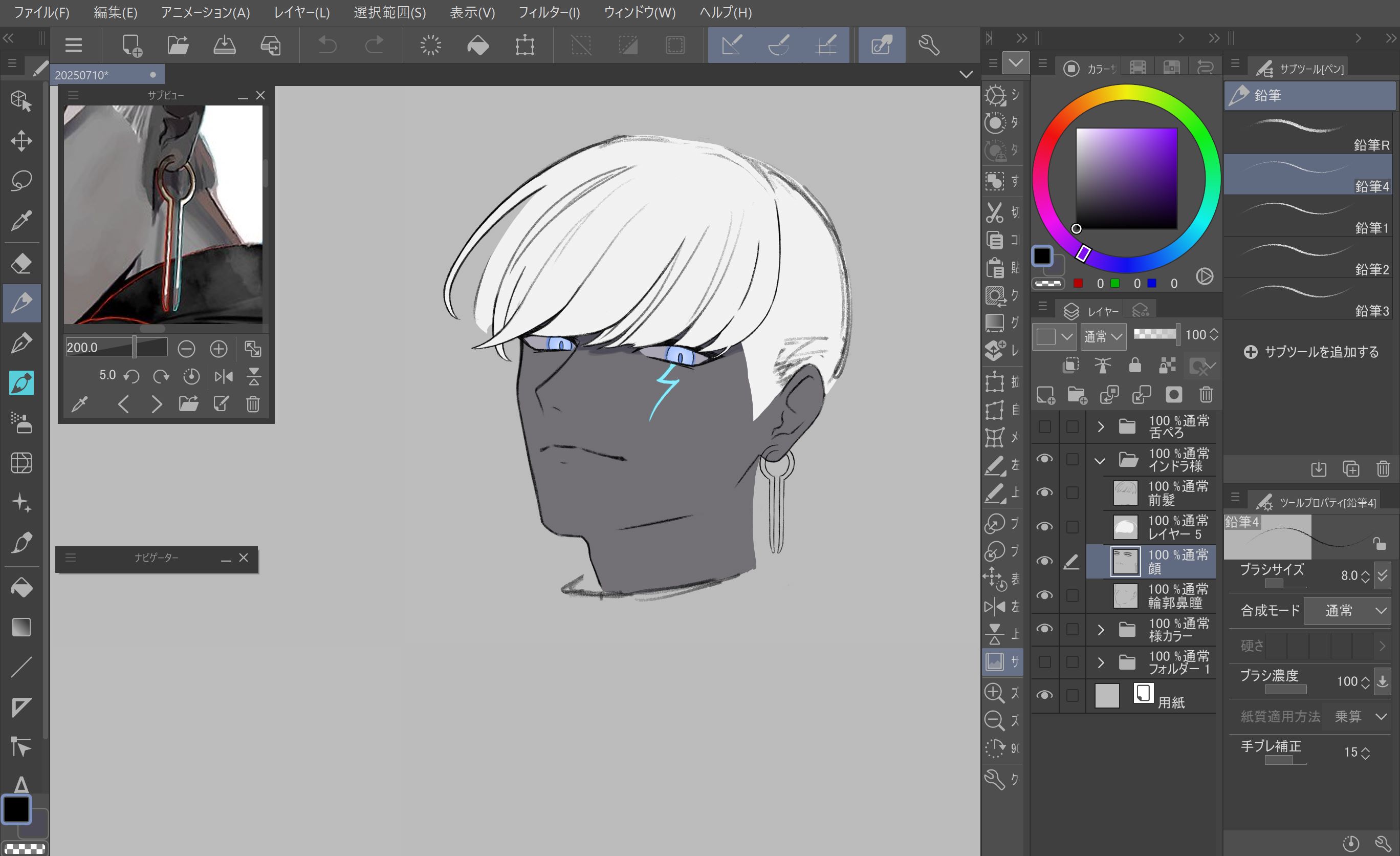 ピアス書いてたらいい感じに虚無になってきたし充電も残りわずかだから今日はもう寝よう……明日髪の毛終わらせてポーズを決めなくては……ポーズは真っ先に決めろ!面長イケメンまともに描いたのこれが初めてなんだけどすごいするする描けて楽しかった。普段美少年美少女や童顔イケメンの輪郭に四苦八苦してたけどそうか……そうだったのか……