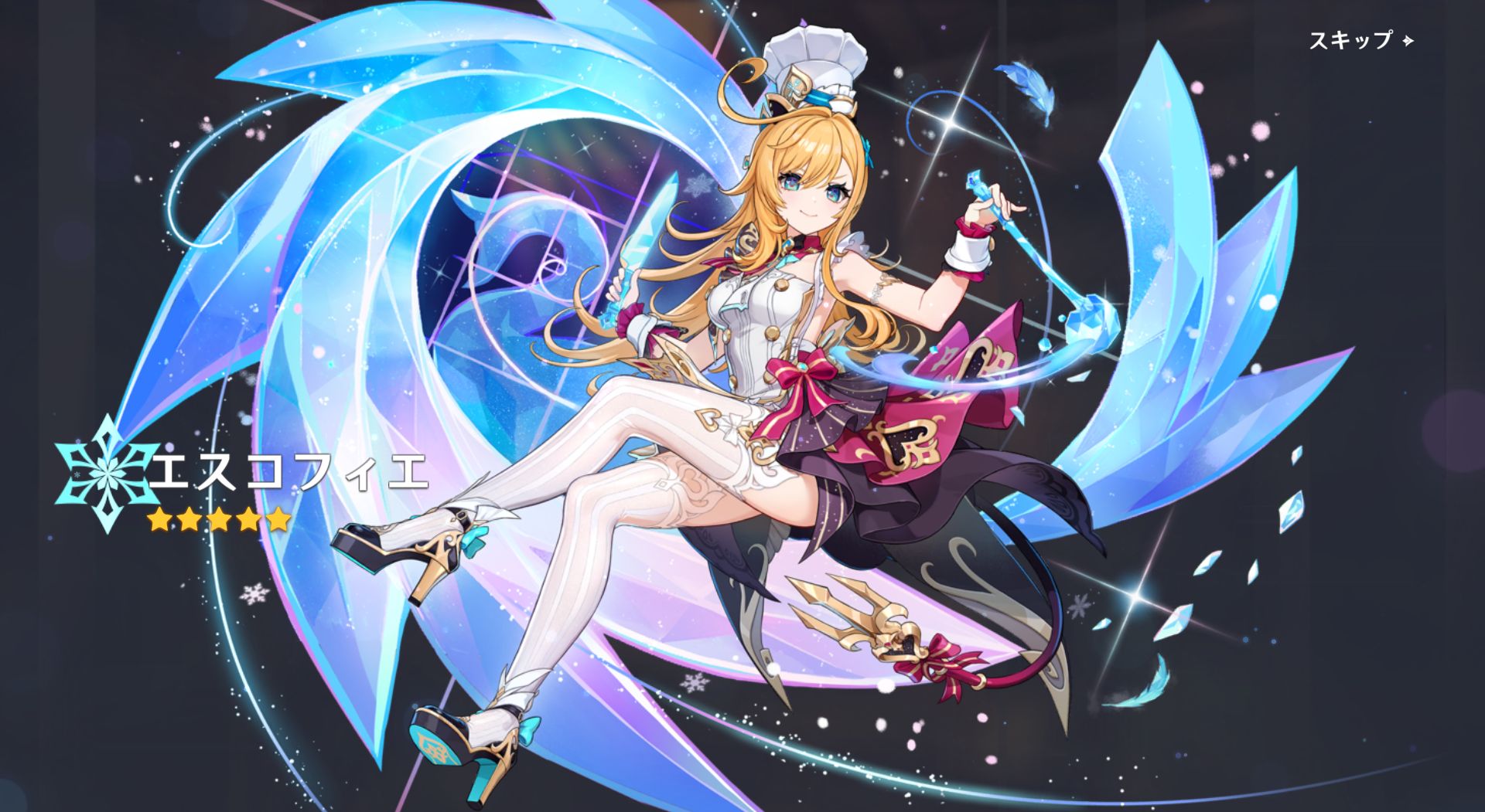 #genshin ちょっとだけまわしたけど特に来てはくれなかった 仮天井叩くか悩む だって次がスカークとダリアだし……いやまあスカークと相性いい気がするけど エスコフィエ あるいはダリアとも相性いい可能性もある 氷水だもんね