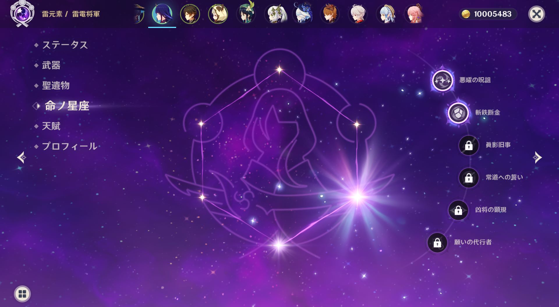雷電九条楓原ベネに始まり、ベネ外すならジン入れてフリーナ使お♪→あっ水無効……(アホ)を経由したあと最終的に雷電八重ジンナヒになった わたしはただ雷電九条と放浪者ファルザンの並びにふふっとなりたかっただけなのに……(?)