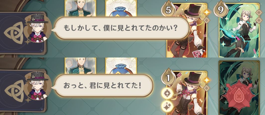 「あははっ、あまり気を落とさないで。そうだ…次は僕がカードを切ってあげようか? そしたらきっと、君にツキが回るよ」これ完全にこっちに有利になるようシャッフルしてくれる気じゃん 手加減……ハンデ……以前に結構なズルじゃ!? お兄ちゃんはさぁ……(お前の兄ではない) 壁炉の家でも手抜かないでよって怒られるタイプのお兄ちゃんなのか? 実際はそもそも気付かれない気がする