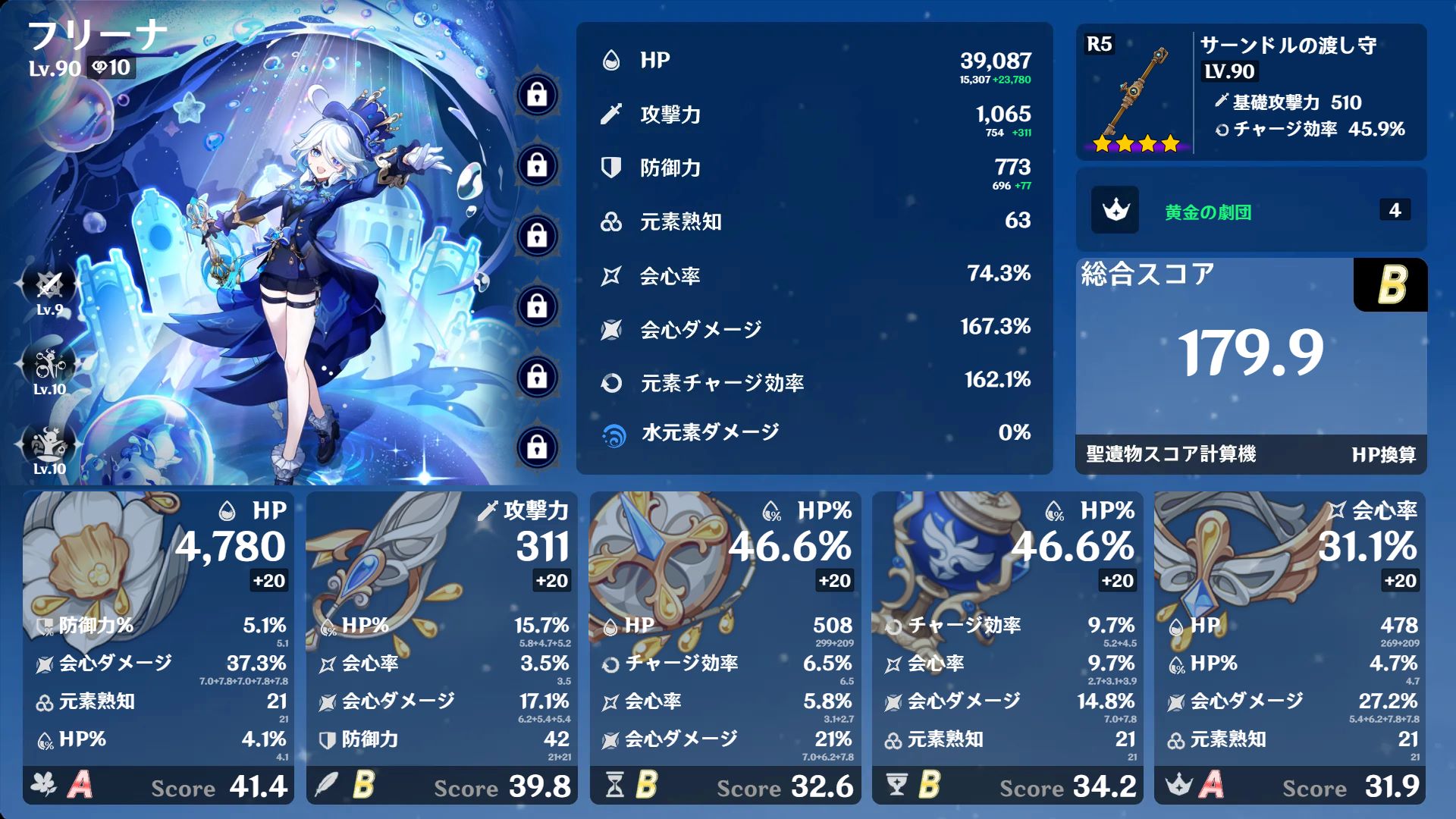 #genshin サーンドルで率+16%するからとりあえずこれでヨシ! フリーナにはこれから深林砂上水仙周回に付き合ってもらうからね……