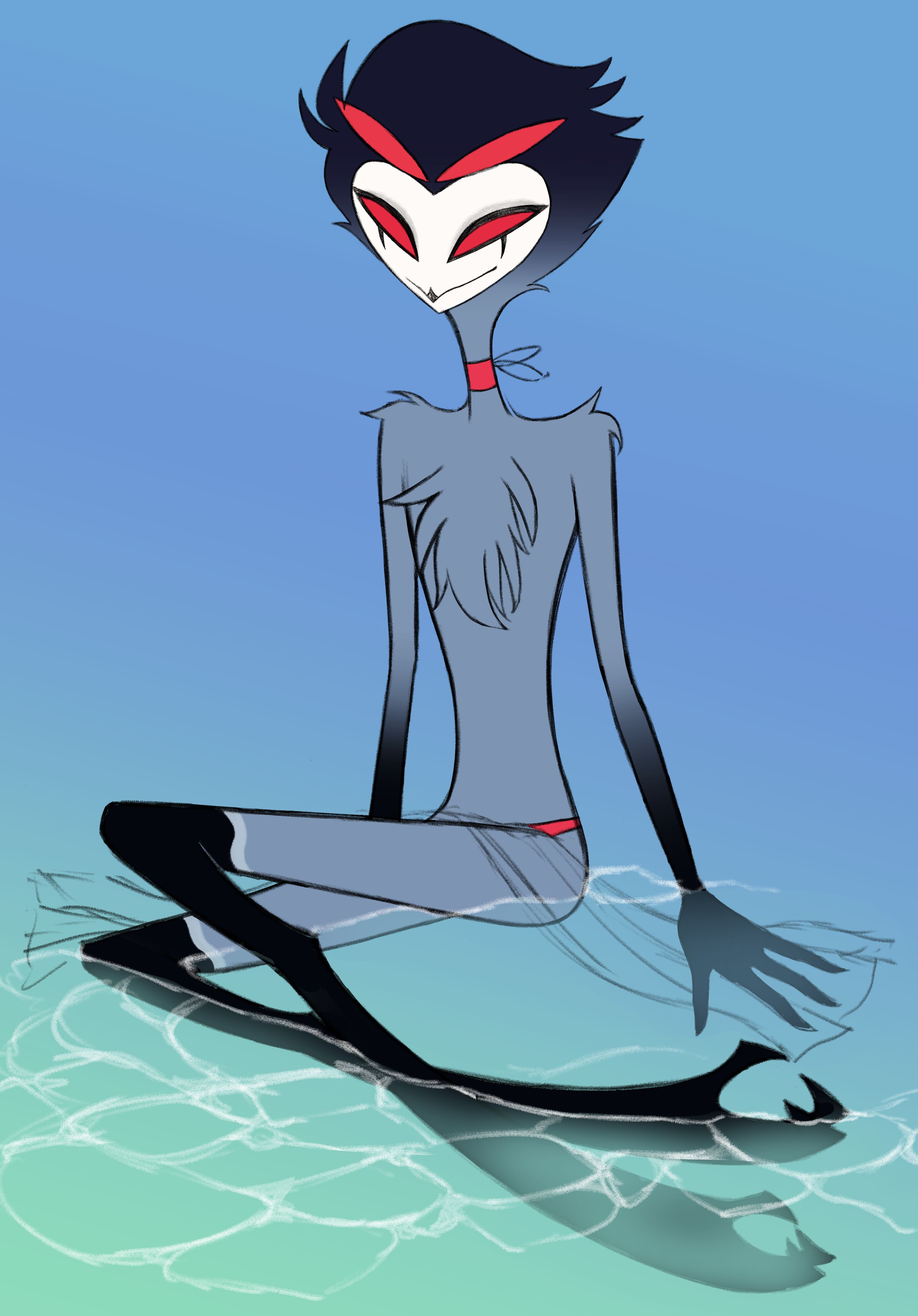 #HelluvaBoss #oekaki 調整してとりあえず色置いてみたけどよくわかんねえ……! なんかこう、海の色とのバランスの取り方が……左右の足の長さが違う気がするな あと胴体が長いというか足をもっと長くしてもいい? ずっとバランスがわかんないよ〜〜 顔は可愛い パーフェクト