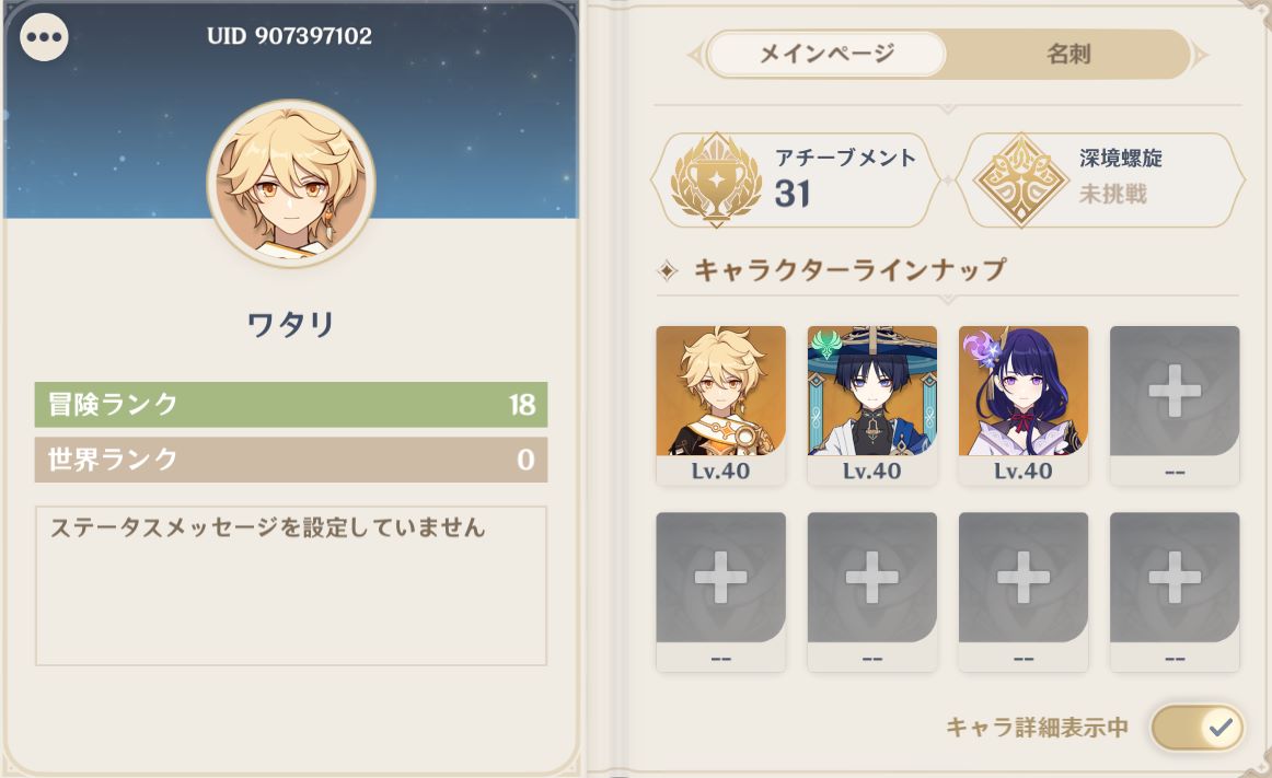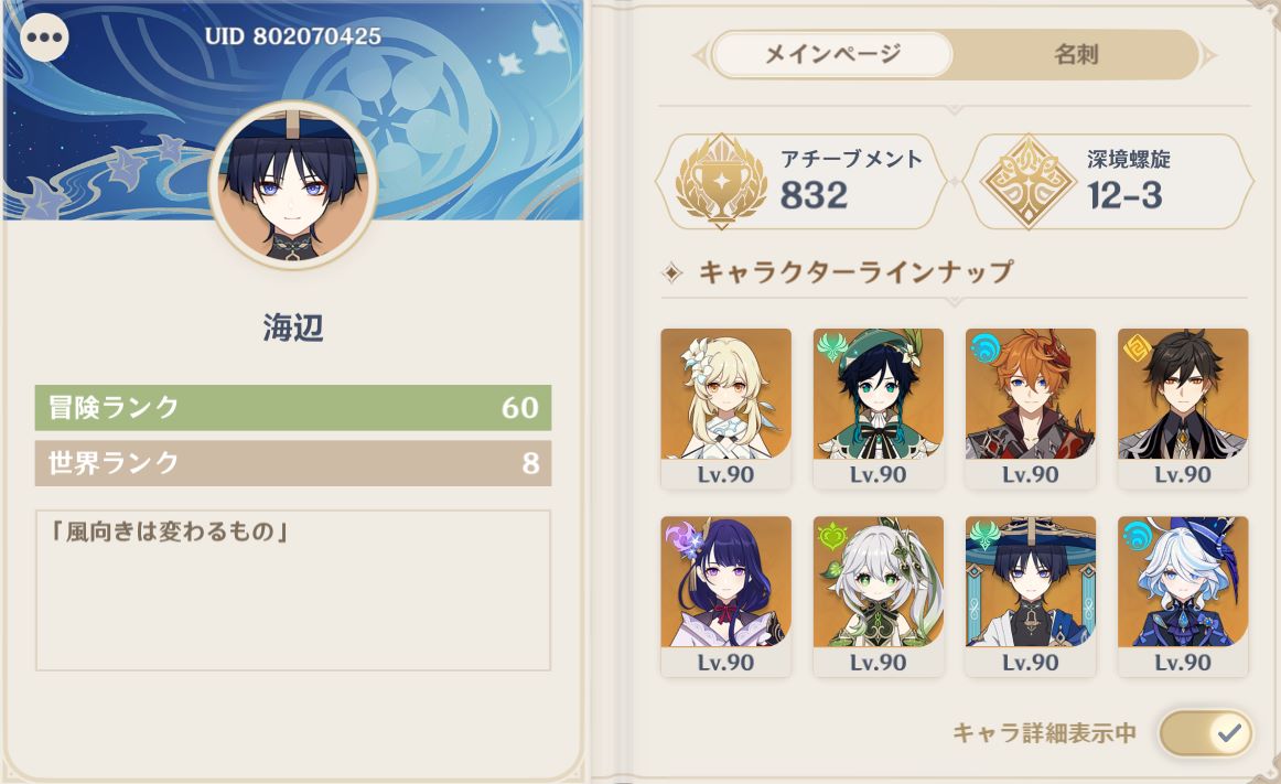 #genshin そういえば私がUID隠してるっていうか切り取ってるのはなんか右端に文字書いてあるなぁ……で気が散るからです なんかぽつんと白文字が浮いてて気が散るんだよ、わたしは……
